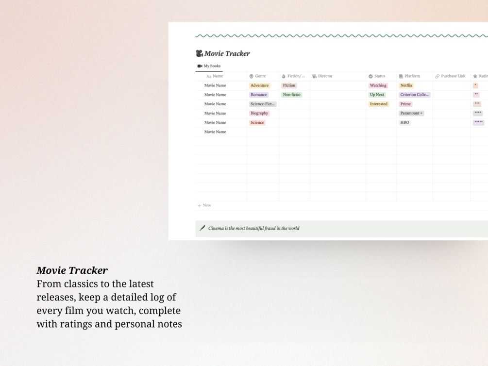 📕 Movie Tracker: From classics to the latest releases, keep a detailed log of every film you watch, complete with ratings and personal notes
