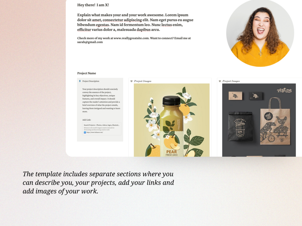 🖌️ The template includes separate sections where you can describe you, your projects, add your links and add images of your work.