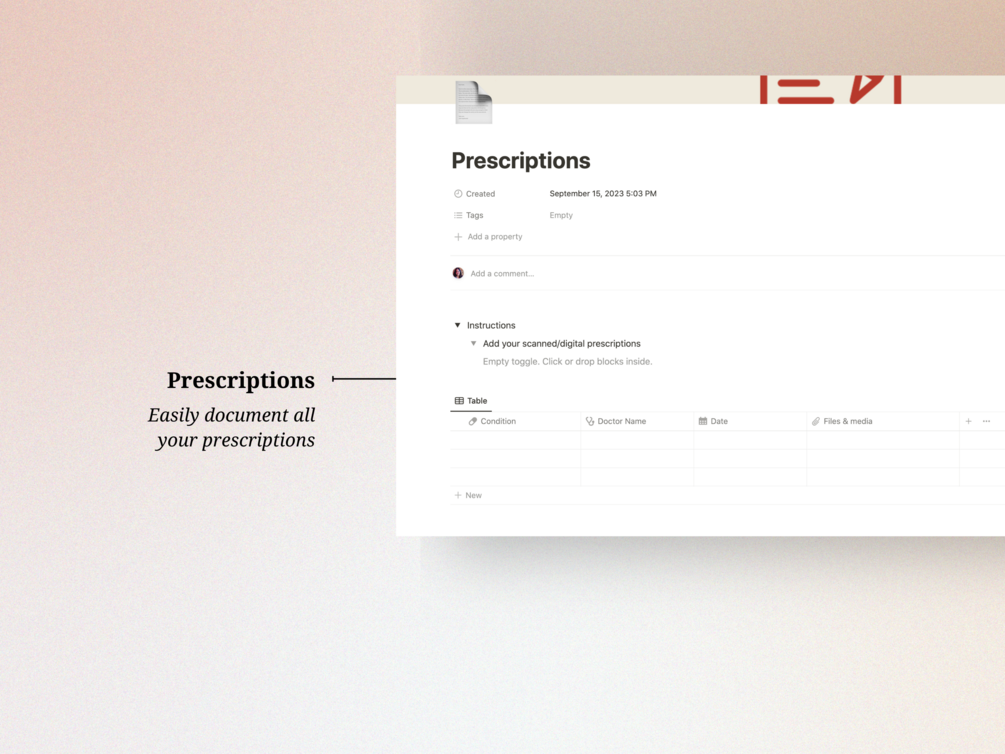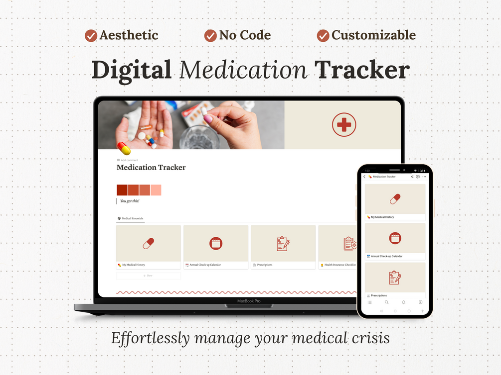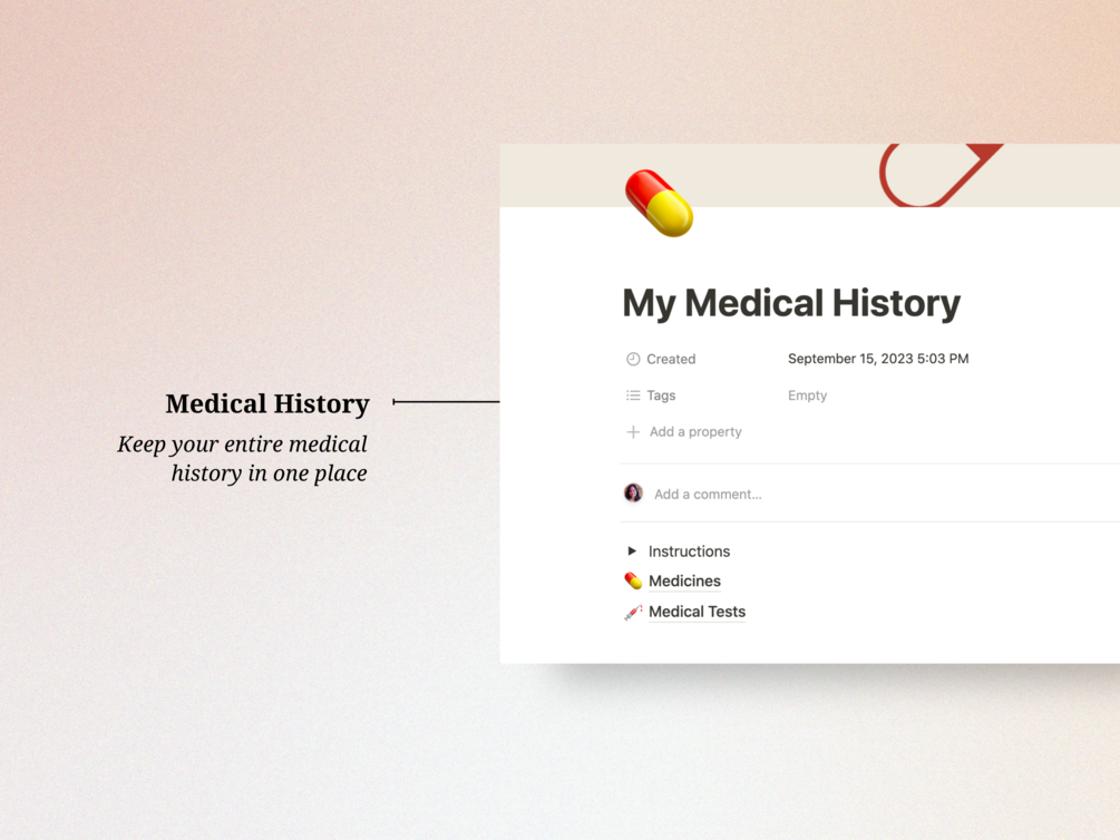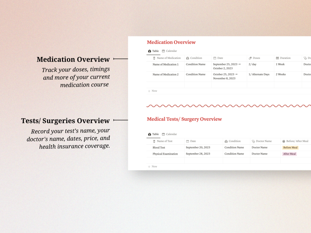 The Notion Medication Tracker is a clutter-free organizer that keeps a track of your pills, medical tests, prescriptions, health insurance and much more!