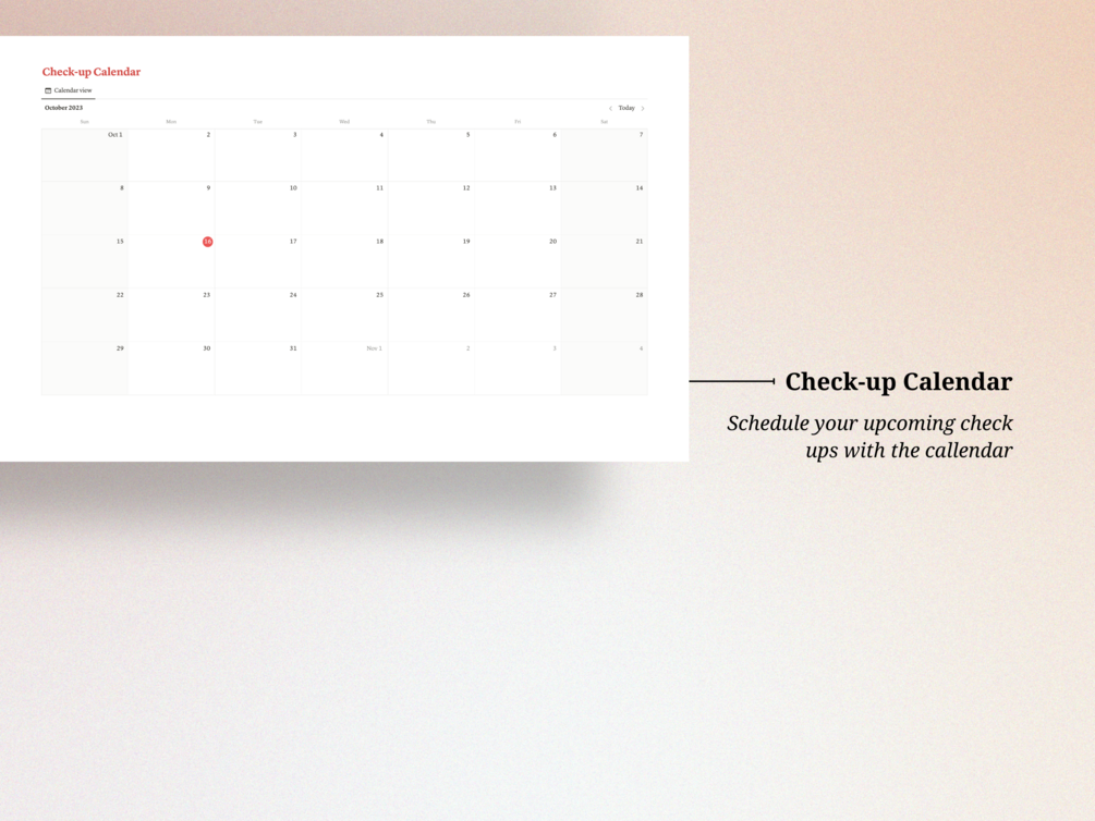 ๐ Check-up Calendar: Stay ahead of your health by always knowing when your next check-up is due. The Check-up Calendar ensures that you're prepared for your upcoming appointments.