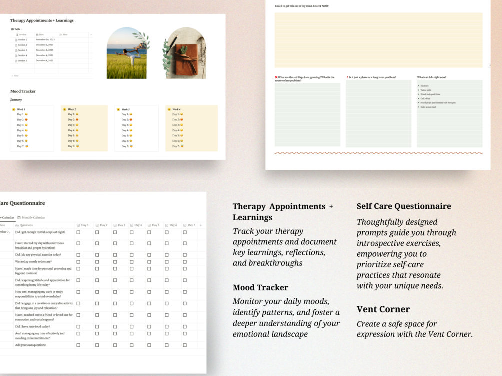 Features: Therapy Appointments + Learnings | Mood Tracker | Medication Tracker | Personal Care Goals: Physical, Mental, Skin, Relationships, Dopamine, Gut | Self Care Questionnaire | Vent Corner
