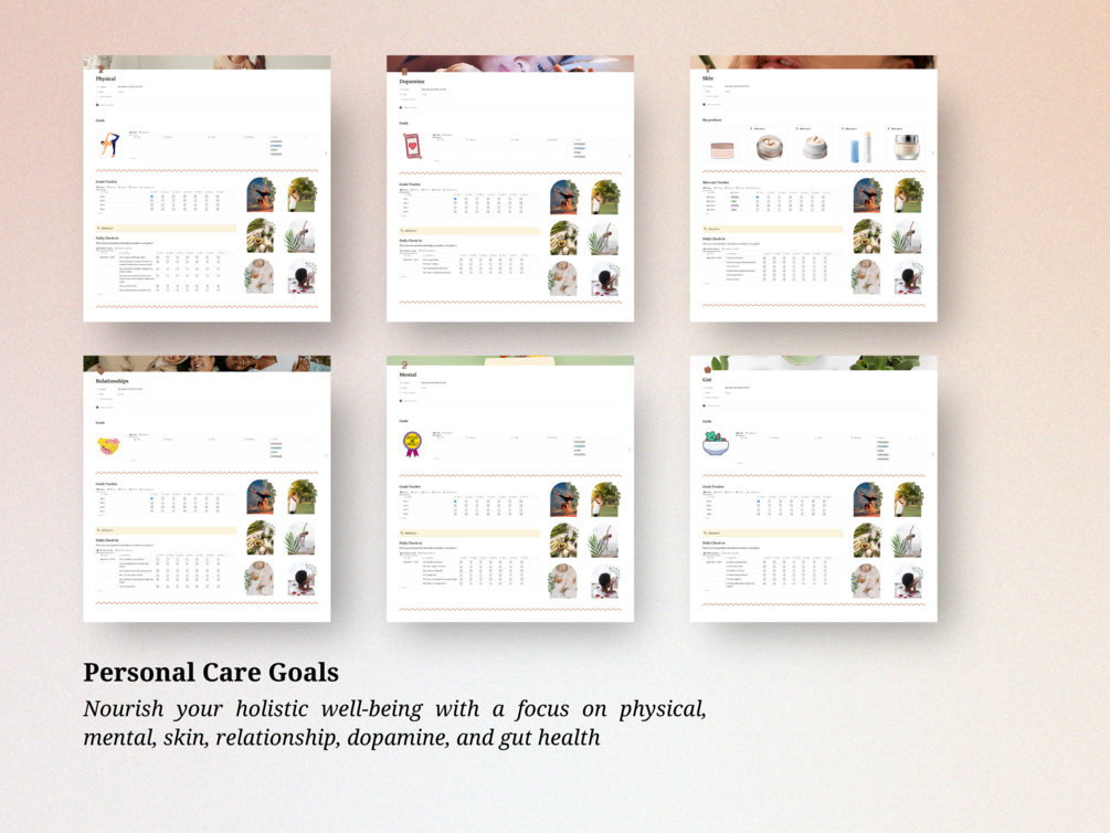Personal Care Goals: Nourish your holistic well-being with a focus on physical, mental, skin, relationship, dopamine, and gut health.