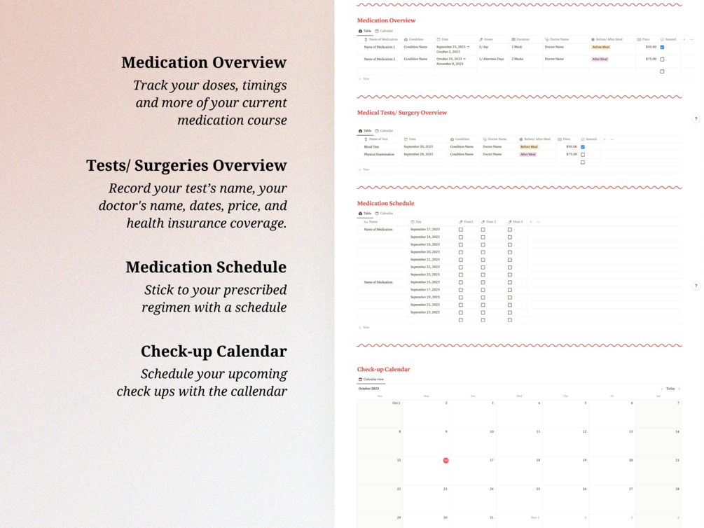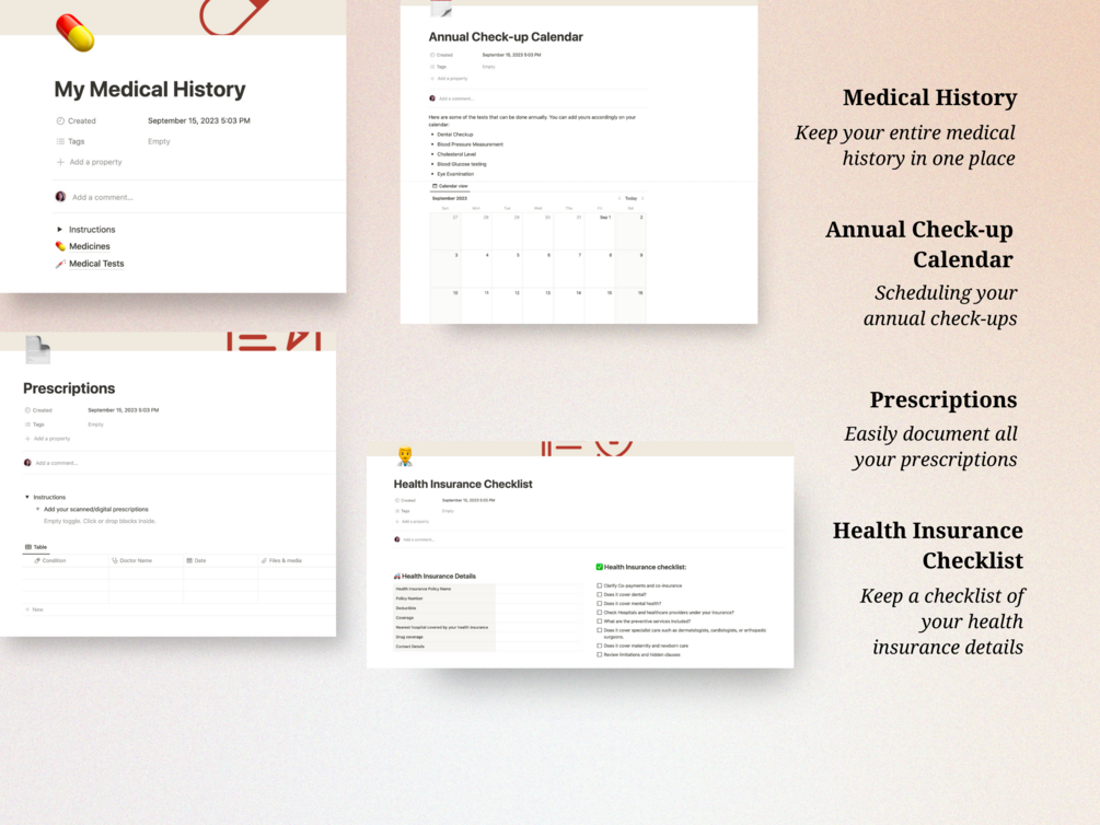 The Notion Medication Tracker is a clutter-free organizer that keeps a track of your pills, medical tests, prescriptions, health insurance and much more!