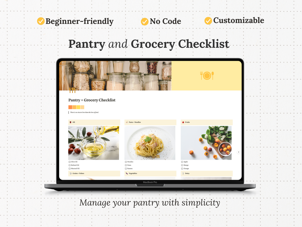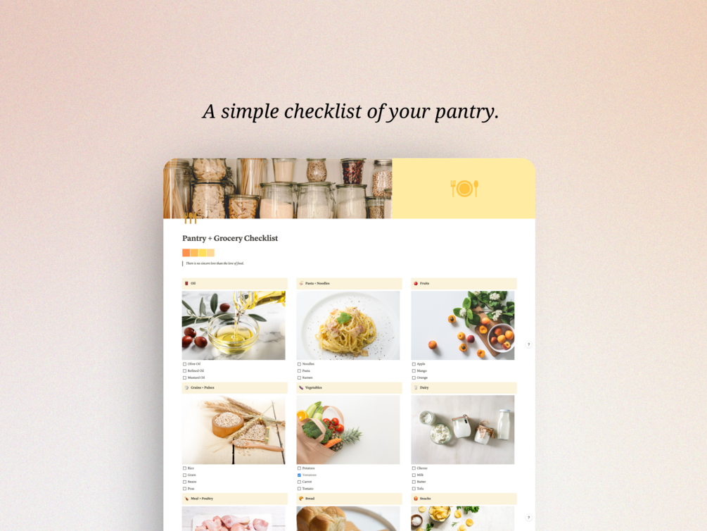 Transform your pantry management routine with our Notion template. Embrace simplicity, efficiency, and organization in your kitchen—because a well-managed pantry leads to stress-free meal preparation. Upgrade your culinary experience today with our Pantry & Grocery Checklist Notion template!
