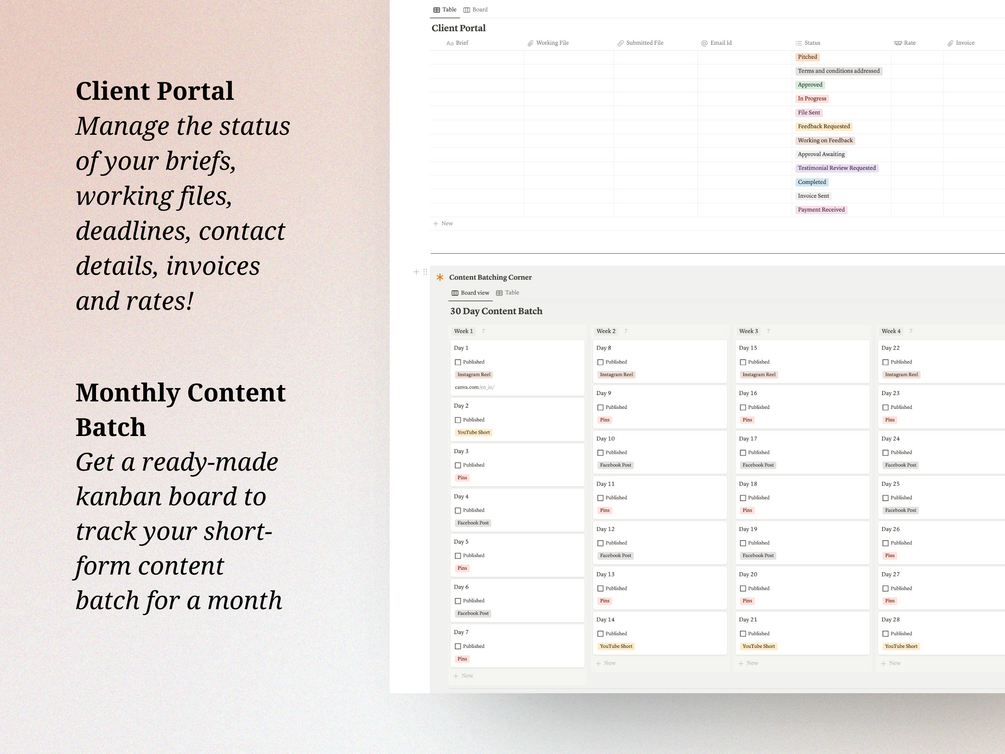 🗓️ Monthly Content Batch: Get a ready-made kanban board to track your short-form content batch for a month