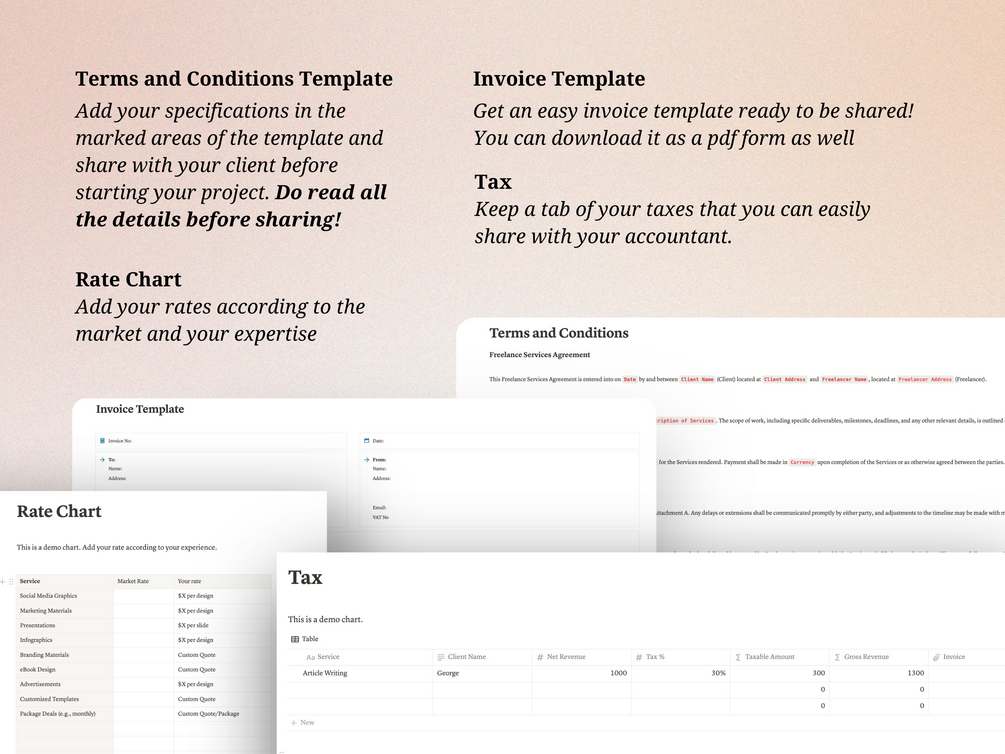 📜 Terms and Conditions Template: Add your specifications in the marked areas of the template and share with your client before starting your project. Do read all the details before sharing!