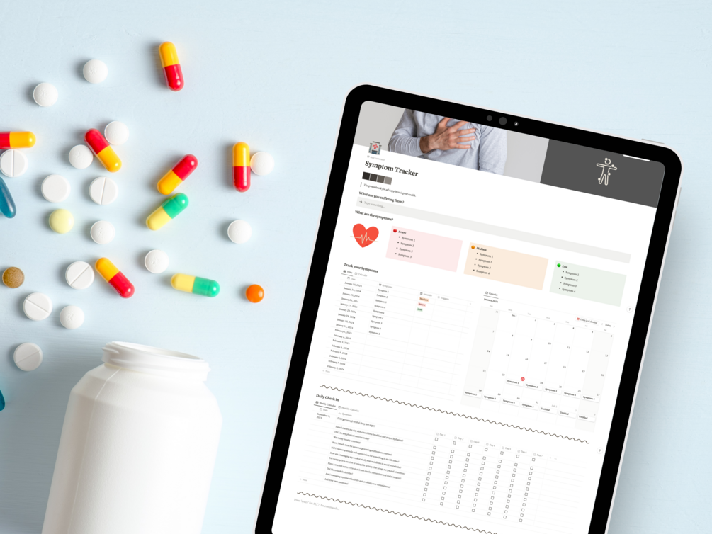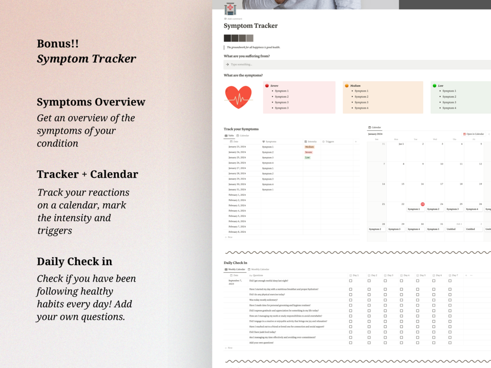 This Symptom Tracker gives a simple overview of your symptoms, a detailed tracking system with a calendar view, and a daily check-in to monitor and enhance your well-being.
